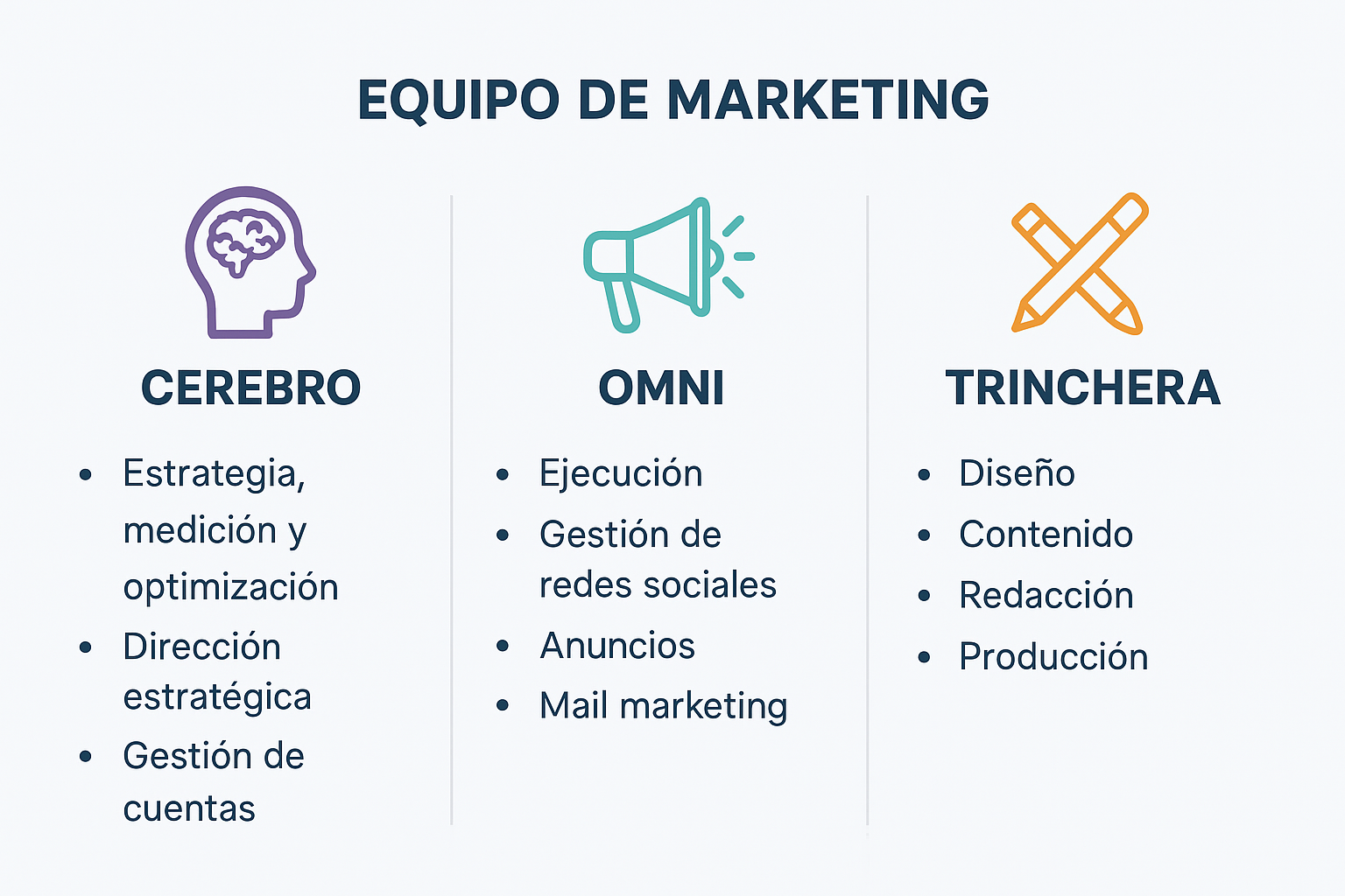 Este artículo profundiza en cómo funciona cada una de estas áreas, por qué son esenciales y cómo se integran para dar vida a campañas que atraen, convierten y fidelizan clientes. Además, exploraremos cómo esta estructura se diferencia de la mayoría de los equipos de marketing tradicionales y por qué genera mejores resultados.